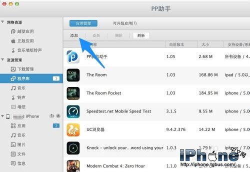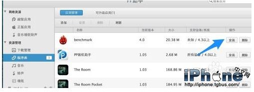 把ipa文件添加到 PP 助手的程序庫以後,接下來請點擊“安裝”按鈕,就可以把這個文件安裝到 iPhone 上了。