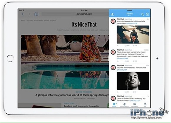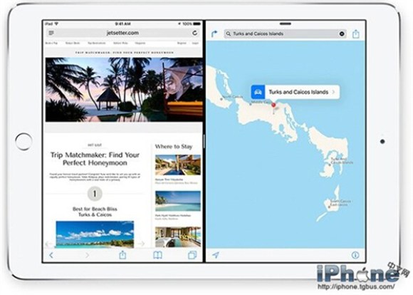 2、Split View功能,可將屏幕分成兩部分,同時運行兩個應用。兩個應用可以五五對半分屏,或者是三七分屏,兩個app能在同一屏幕上同時並行運作。也支持同一款應用的多界面,比如Safari浏覽器中可並排擺放兩個標簽頁。此功能目前只能在iPad Air2上實現。