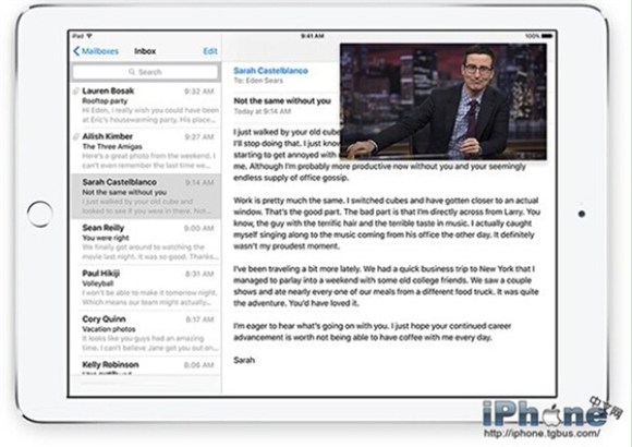3、Picture in Picture功能,用戶在看視頻過程中如果想看或回郵件,視頻將以懸浮窗口的形式保留在屏幕上,大小和位置可任意調整。該功能在iPad Air、iPad mini上均可實現。