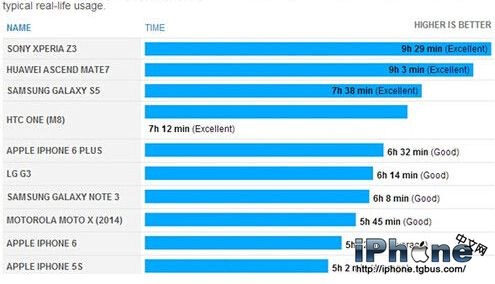 此外,4.7英寸iPhone 6的續航時間只是比iPhone 5S多了20分鐘,為5小時22分鐘(5S時間是5小時2分鐘)。反倒是新近推出的Z3和Mate 7的續航成績表現異常優秀,分別位列這一排行榜的第一名和第二名。