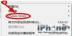 2.然後在打開的itunes頁面當中找到頁面最左上方的【向下】箭頭。然後進入到【itunesstore】。