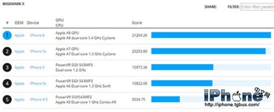 國外評測機構Rightware Basemark X最新對蘋果最新發布的iPhone 6進行測試,結果顯示全新A8移動處理器的iPhone 6跑分為21204,僅比iPhone 5s提升不到5%。