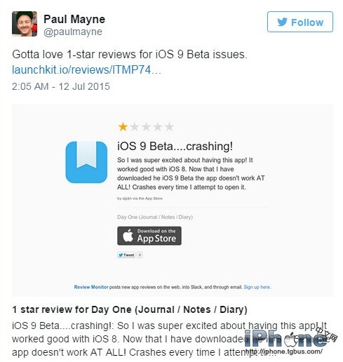 更糟糕的是,有些人甚至將1星評價分享到了Twitter等社交媒體上,並且打上了“iOS 9.0上不能用”(Broken with iOS 9.0)等注腳。萬幸的是,蘋果終於剎住了車。不過有意思的是,盡管iOS9測試版用戶無法提交評論,但仍可以留下相關應用的星級評定。