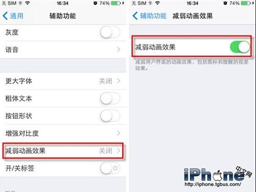 另外,iOS8有很多動畫效果,例如文件夾縮放、圖標浮動特效等,這些動畫看起來不錯,但它同時是以犧牲處理器性能和電量為代價的,所以關閉最明顯的縮放動畫效果也可以提升電池續航。進入“設置-通用-輔助功能-減弱動畫效果”,然後將“減弱動畫效果”一項開啟即可。
