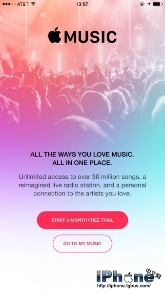 打開Apple Music之後,它會出現非常漂亮的歡迎頁面,告訴你可以免費試用三個月,裡面有超過3000萬首歌,同時還有廣播電台,以及可以通過這個App和音樂人們聯系。