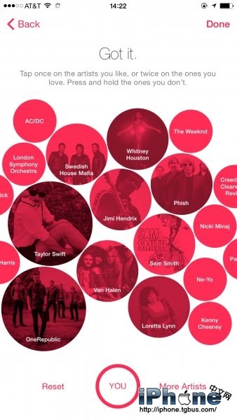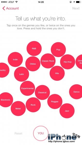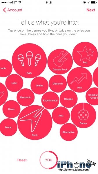 選好之後,進入個性化設置界面。熟悉Beats Music的人看了會覺得眼熟,很多紅色的小圓,上面都是各種音樂流派的名字,比如R&B,流行音樂、搖滾、爵士等。