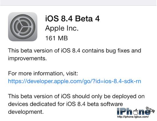 值得一提的是,根據蘋果指出(上圖):升級到 iOS 8.4 Beta 版的設備是不能夠恢復到之前版本的 iOS 的。iOS 8.4 正式版將會在 6 月底發布,而有消息指出 iOS 8.4 推送後,iOS 8.3 的越獄工具也將會放出。