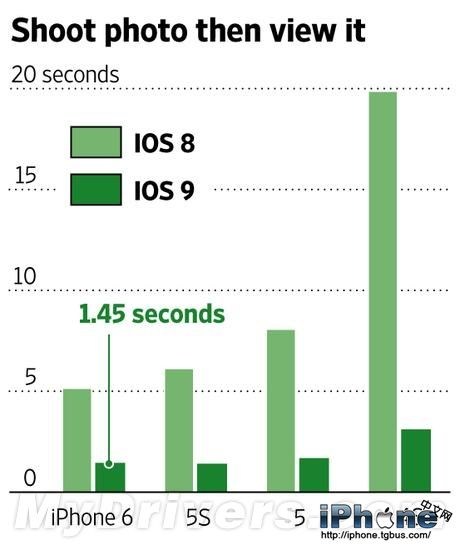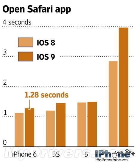 在測試中,時間差異最大的是iPhone 5的啟動速度,iOS9比iOS8慢了3秒。