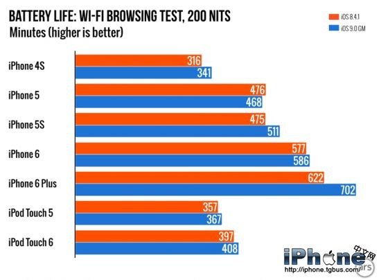 據介紹,iOS 9的一大特性是能夠增強蘋果設備的續航。那這是不是真的呢?本輪測試同樣對iPhone 4s、5、5s、6、6 Plus等在iOS 8.4.1和iOS 9.0系統下的續航進行了測試。根據時間數據,大部分設備都有微量的提升,手機方面iPhone 6 Plus的提升最為明顯。