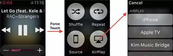 4.AirPlay控制:使用ForceTouch在不同的AppleWatch應用中可以開啟交互的全新方式。在音樂應用中,可以使用ForceTouch開啟AirPlay功能,並使用iPhone作為音樂播放設備。除了音樂播放界面,AirPlay功能無法在音樂應用的其他界面開啟。我們也可以在AppleWatch上直接播放音樂。通過ForceTouch操作可以開啟新菜單選擇,並點按Source來源選擇音樂。