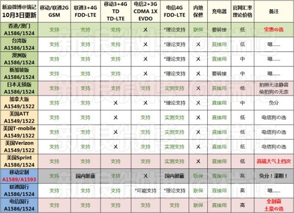 當然,iPhone6/6 Plus不同版本的支持網絡情況也不是有所區別的,網友總結出來了一個表格,大家可以參考一下。