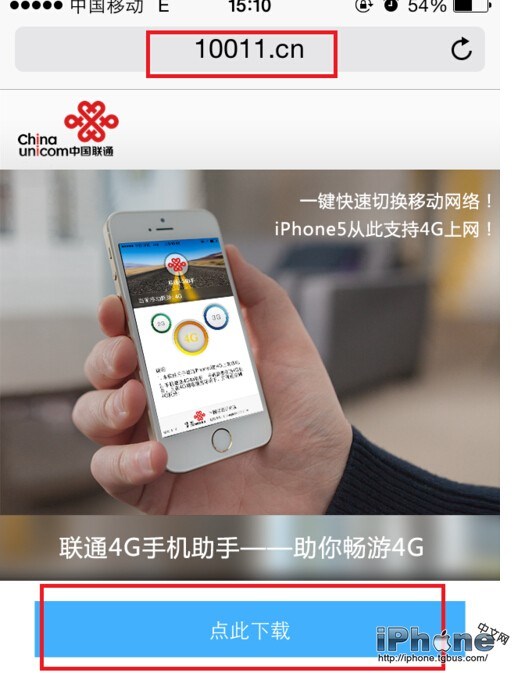 第二步:如何安裝軟件,只需有iphone的浏覽器在浏覽器裡面輸出10011.cn即可,點擊“點此下載”按鈕後,該APP就會自動出現在桌面上,如下圖