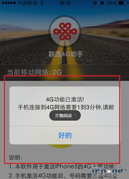 第三步:進入APP,選擇4G激活,然後會出現等待1-3分鐘,成功後在手機界面上面的信號處就會出現4G的信號,OK,恭喜你,你的手機能完美運轉4G了
