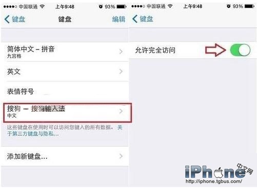 3.如果你此前安裝了百度輸入法、搜狗輸入法,那麼在這裡就可以找到,我們點擊第三方輸入法,將其添加到iOS8輸入法中來即可。這裡以添加搜狗輸入法為例,添加完成後,在iOS8鍵盤設置中,就可以看到了,之後再點擊進入,將其權限設置為“完全允許”。