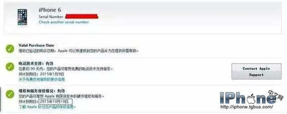由於iPhone6是從激活日起保修一年的,從圖中,我們可以看到iPhone6 Plus保修到期時間是2015年10月10日,如果這這個日期與購入後的激活時間相差一年,就可以判斷屬於正品行貨新機。