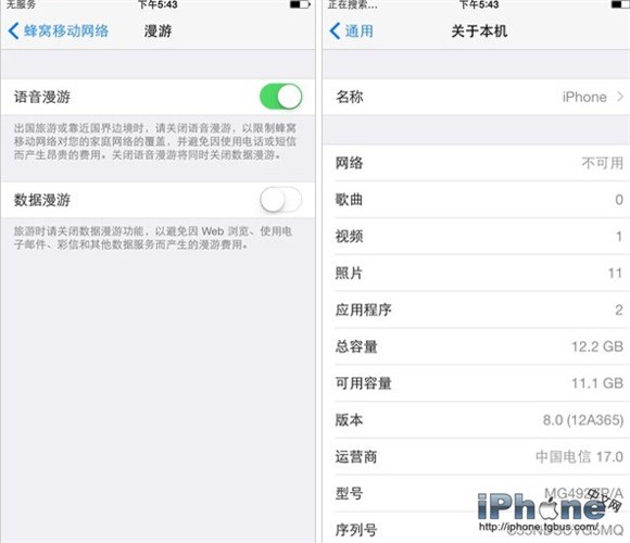 打開關於本機頁面,運營商會顯示中國電信,但是搜索不了信號,仍然處在無服務狀態。因此港版iPhone 6實際硬件是能夠支持,但是因為政策等一些原因,CDMA電信網絡是軟屏蔽的。此外中國電信網絡暫時並未部署SRLTE和SVLTE,因此即使iPhone 6能搜索到4G信號,也不能回落到CDMA電路域進行通話。因此電信用戶要想使用4G,時間還早著。
