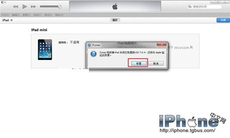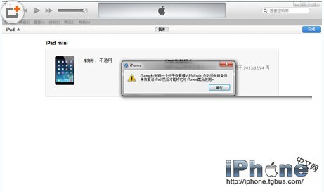 二、iTunes會自動檢測到一台等待恢復的設備,點擊確定: