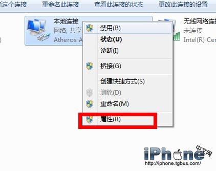 5、選中“本地連接”,右鍵彈出菜單,選擇“屬性”;