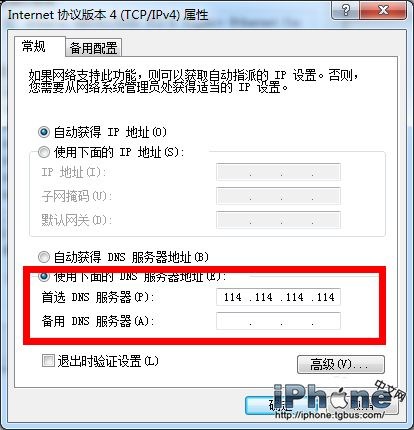 7、在屬性對話框中選擇“使用下面的DNS服務器地址”,在“首選DNS服務器(p)”一欄中輸入“114.114.114.114”.然後選擇確定即可。