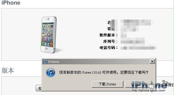 下圖中【現在有新版本的itunes(10.6)可供使用。您要現在下載嗎?】就是表示itunes有了更新的版本10.6版本,然後點擊【下載itunes】。對itunes的更新對iPhone或者iPad是沒有影響的。