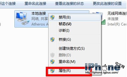 選中“本地連接”,右鍵彈出菜單,選擇“屬性”