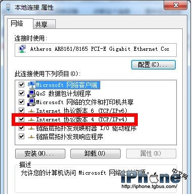 在彈出對話框中選擇“網絡”選項卡中的“Internet協議版本4(TCP/IPv4)”