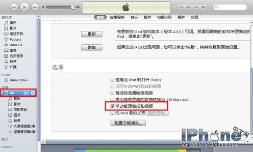 手動導入需要在設備信息頁的下方,勾選“手動管理音樂和視頻”。
