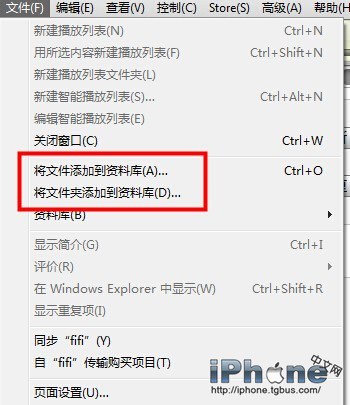 點擊iTunes頂部的“文件”菜單,可以看到兩個添加選項:將文件添加到資料庫、將文件夾添加到資料庫。添加文件可以選擇文件夾中的一個或幾個添加,而添加文件夾則會將整個文件夾中的所有內容全部添加,大家可以根據自己的需要來選擇使用哪種方式。