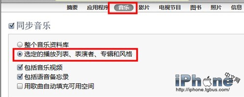 在設備信息頁,點擊設備信息上方的“音樂”標簽,進入同步音樂設置,將同步“整個音樂資料庫”改為同步“選定的播放列表、表演者、專輯和風格”。