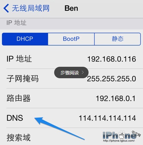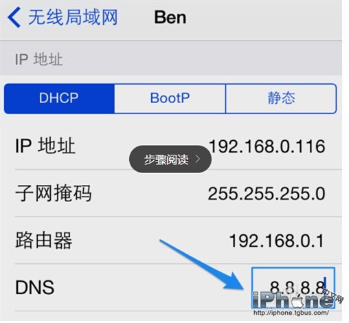 5.接下來請刪除原來的 DNS 地址,輸入新的 8.8.8.8 這個地址。好了以後點擊左上角的“無線局域網”返回,如圖所示