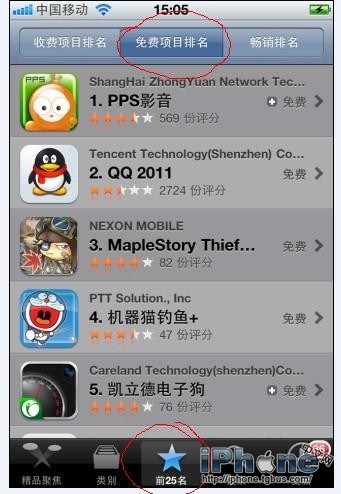 第一步:打開iPhone,選擇app store進入,然後點下方的“前25名”,接著點上面的“免費項目排名”,選擇第一個軟件進入。