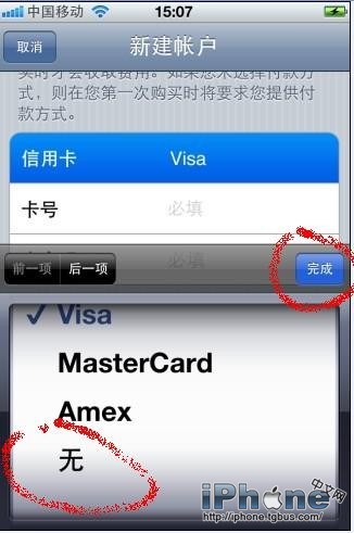 第四步:關鍵的來了,如果前面操作時是從免費軟件進入注冊,這時候就會多出一個信用卡選項“無”。如果你是直接從電腦上的itunes注冊,或者直接iPhone的app store注冊就不會出現這個“無”的選項。當然,我們前面特意從免費項入手的主要就是要出現這個“無”,那麼現在我們華麗麗的選擇“無”吧。