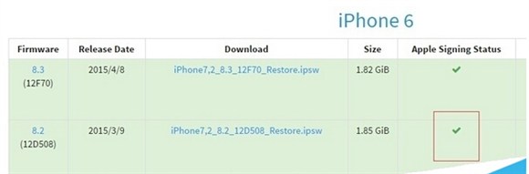 當時iOS8.2一欄顯示綠色的小勾,即代表能降級到iOS8.2