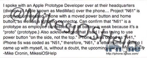 今天來自t3chmuz消息,從蘋果內部打探到關於iPhone6手機的確定消息,截止到目前為止網上曝光的iPhone6機模真的是按照蘋果iPhone6而制成的,該原型機的代號是N61。