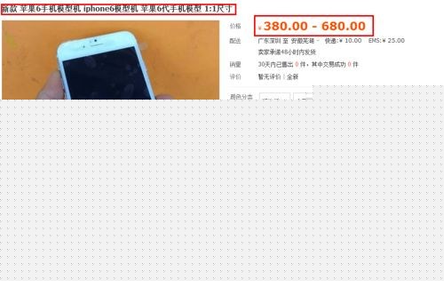 該廠商就是抓住這一商機,開始火熱出售iPhone6模型,有塑料的,有金屬版,出售價格只要380元-680元不等。不難看出,已經有用戶開始購買了。
