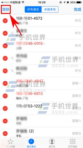 1)首先打開【電話】應用,打開後點擊下方的標簽切換到【最近通話】界面,這時就能看到通話記錄,再點擊右上角的【編輯】按鈕。(如下圖)