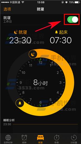 1)打開自帶的【時鐘】應用,進去後點擊下方的標簽【就寢】切換到就寢界面。(如下圖)