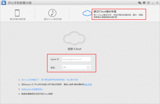 步驟二、運行開心手機恢復大師,可以看到軟件主界面有“通過設備掃描恢復”、“通過iTunes備份恢復”和“通過iCloud備份恢復”三種不同的模式,我們選擇第三模式進行蘋果手機照片的恢復操作,所以需要根據提示輸入Apple ID和密碼;