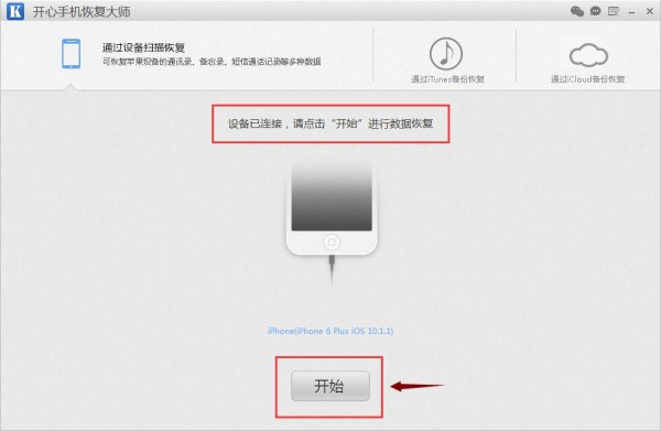 第三步、運行軟件,等待軟件識別到設備並提示“設備已連接”就可以點擊【開始】按鈕直接進入微信聊天記錄恢復模式了;