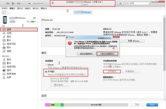 b.備份:使用蘋果手機數據線將蘋果手機連接到電腦上,打開iTunes工具,軟件成功識別設備後,請在“摘要”中的備份區域選擇手“本電腦”將整機備份數據儲存在電腦上,然後點擊“立即備份”,請不要加密備份或是備份應用程序。