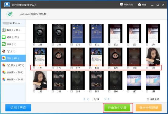 4.恢復:在強力蘋果恢復精靈(蘋果恢復精靈)左側選擇“圖片”,查看手機上的照片文件,找到想要恢復的照片,點擊勾選,然後一鍵按下“導出選中記錄”按鈕即可恢復蘋果手機誤刪的照片文件。