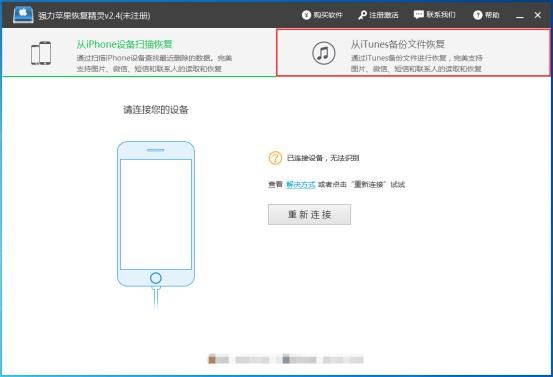 1.模式:強力蘋果恢復精靈(蘋果恢復精靈)有兩個恢復功能,iPhone設備掃描恢復和iTunes備份文件恢復,請選擇“從iTunes備份文件恢復”切換界面。