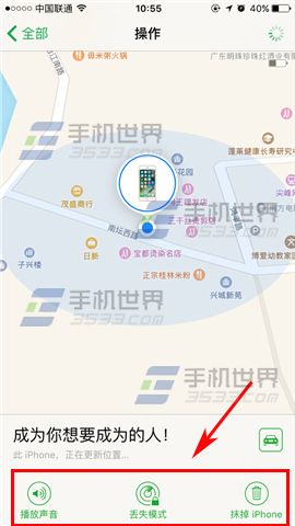 2)隨後我們點擊【操作】,顯出選項可以先查找位置,然後看看需不需要抹掉數據,根據提供的位置來到目的地後可點擊【播放聲音】進行識別位置。(如下圖)