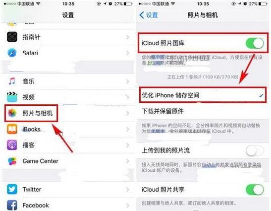 2、還有一個能瞬間騰出很多內存的方法就是將照片上傳至雲空間,對於照片多的用戶尤其明顯(手機裡的照片不會消失的,只是將內存“移動”到雲空間了),首先打開手機【設置】,然後下拉找到【照片與相機】,隨後再將【iCloud照片圖庫】那欄打開有點擊【優化iPhone儲存空間】就可以了。(如下圖)