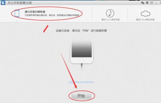 第二步: 打開軟件之後會看到主界面上有三種模式可以恢復蘋果手機的短信,我們將手機用數據線連接到電腦上,當提示設備已連接的時候,直接默認第一模式,點擊界面下方的“開始”按鈕;