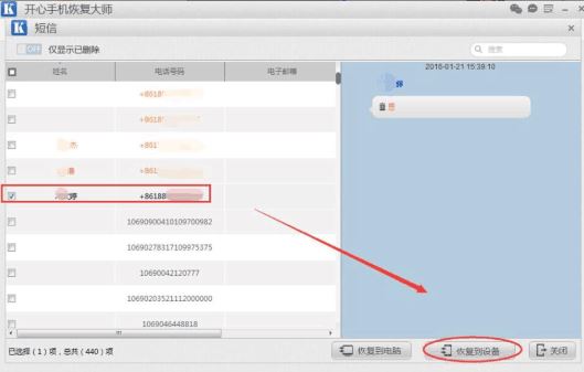 第五步: 在界面左側勾選想要恢復的短信的選項,然後點擊右下角的“恢復到設備“的按鈕,就可以將短信數據恢復到自己的手機上了。