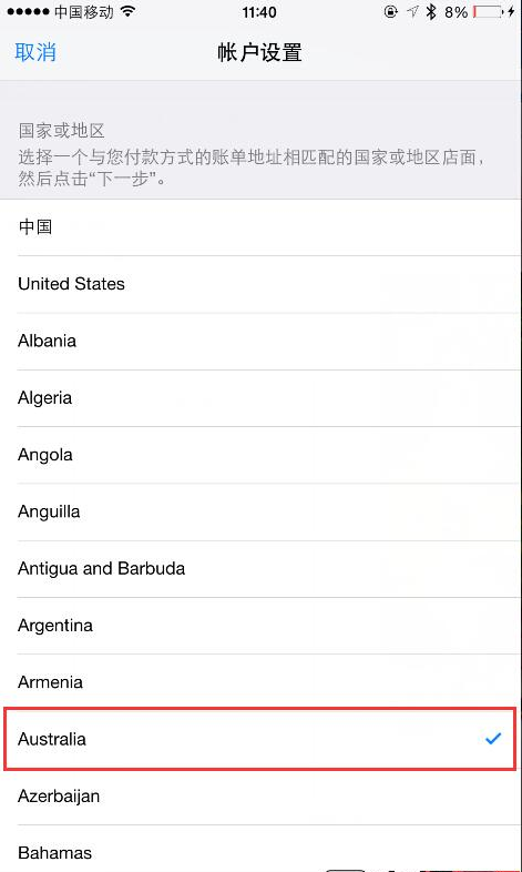 第二步:選擇國家地區界面中,在列表中找到【Australia】澳大利亞。