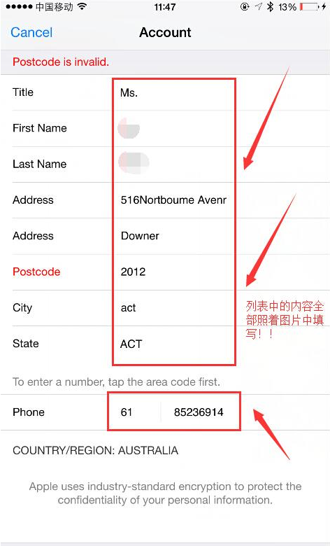 第三步:填寫國家地址信息,這邊的信息按照圖片中的內容一字不改的填寫,圖中內容為澳大利亞國家地址。