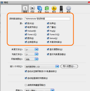 <1> 可以設置資料庫中的子菜單,有些平時沒有用到的就可以不去設置,選擇設置經常能用到的就好,比如應用程序、鈴聲、音樂、廣播等。小編個人對大家的友情建議:大家可以將設備選項裡的防止ipod、iphone和ipad自動同步打鉤。如圖所示: