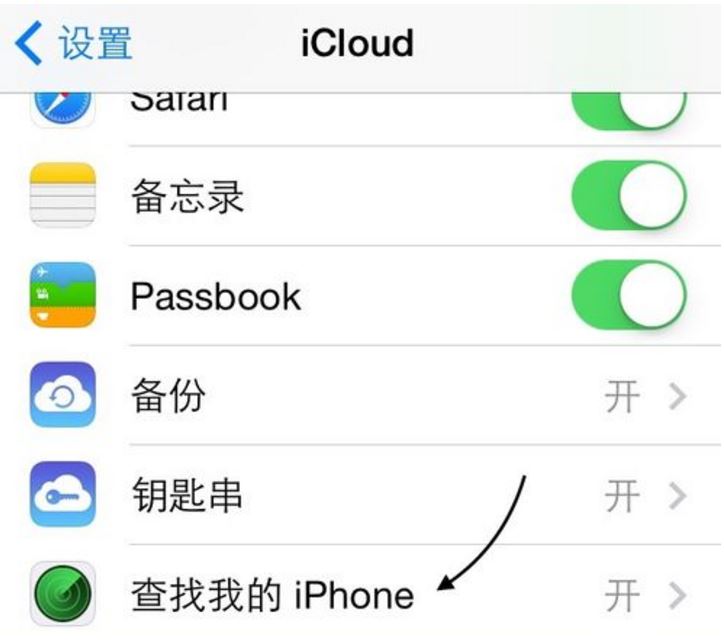 4、當用AppleID登錄iCloud服務以後,請確保功能列表中的;查找我的iPhone;已經開啟。